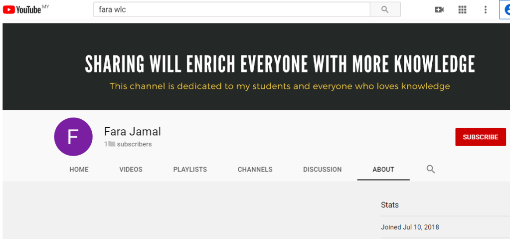 Alhamdulillah. Niat nak buat video tutorial dah lama dipendam dalam hati. Akhinya 10 Julai 2018 berjaya juga buka Youtube Channel Fara Jamal ni. Kejar subscriber sebab nak jadi Youtuber? Itu semua bukan niat channel ini diadakan. Niat saya hanya untuk berkongsi ilmu pengetahuan yang saya ada. Saya muat naik video tutorial cara menggunakan aplikasi Packet Tracer di Youtube Channel Fara Jamal ini disebabkan saya sendiri kadang-kadang terlupa command configuration. Boleh tengok video sendiri kalau terlupa. Pelajar saya juga berbuat demikian jika terlupa ajaran saya. Hehe. Saya telah mengambil risiko dengan menghidangkan pengunjung Channel ini dengan video tutorial yang bukan menjadi carian ramai. Memang sesuai sangat la jumlah subscriber krik3 je. Tapi yang menghairankan ada satu video tutorial saya yang jumlah tontonannya tidak kurang daripada 20 setiap hari daripada seluruh dunia. Alhamdulillah, semoga video-video tutorial saya boleh menjadi asbab bertambah pahala. Saya berazam akan cuba menambah video tutorial yang terbaik untuk pengunjung Youtube Channel Fara Jamal ni. Pautan Youtube Channel Fara Jamal boleh klik disini. Sila subscribe Youtube Channel Fara Jamal hanya jika anda sudi. Tiada paksaan akan dikenakan 😉