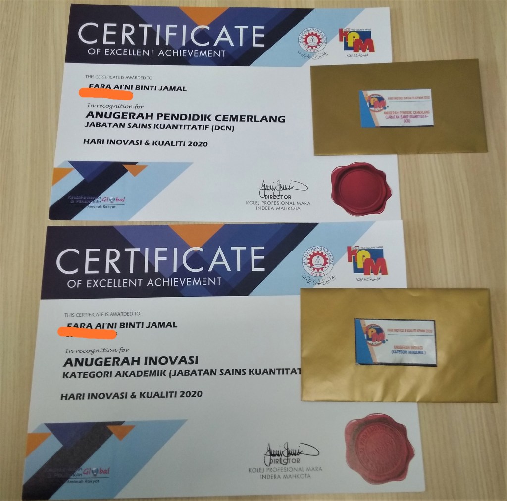 Saya menutup tahun 2020 ini dengan kenangan agak manis. Walaupun kita semua terpaksa melalui PKP beberapa bulan dan mulai menjalani kehidupan norma baharu, saya telah mengambil peluang itu untuk melakukan 2 penulisan, menyertai pertandingan inovasi dan menjadi fasilitator jabatan bagi mengajar aplikasi Ms Teams dan Ms Forms. Sebelum PKP, saya sempat menyertai 1 pertandingan inovasi, 2 aktiviti khidmat masyarakat dan menjadi fasilitator kursus kecemerlangan pelajar kelolaan jabatan saya. Rupa-rupanya ada 2 nama saya terselit dalam senarai penerima anugerah majlis Hari Inovasi & Kualiti 2020 yang diadakan pihak majikan pada 24 Disember 2020 yang lalu. Saya bersyukur ke hadrat Ilahi kerana dikurniakan rezeki yang tidak dijangka ini. Semoga anugerah ini akan menjadikan saya terus konsisten dalam memberikan yang terbaik dalam kehidupan ini. Doakan saya ya pembaca.